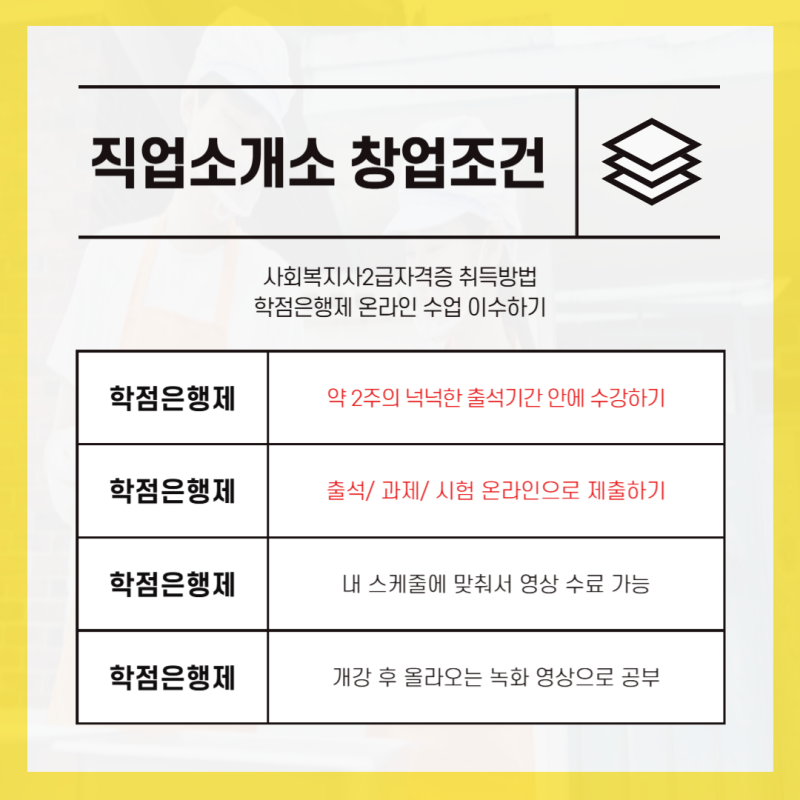직업소개소를 시작하기 위해서는 다양한 조건이 있었습니다. 1) 직업상담사 자격증 1급 또는 2급 소지자2) 노동변호사 자격증 소지자3) 국가/지방자치단체 공무원 2년 이상 경력자4) 교사 자격증 소지자5) 사회복지사 자격증 소지자 이 5가지 조건은 다음과 같습니다. 위 사항 중 하나라도 충족되면 창업이 가능했지만, 여기에 맞는 내용이 하나도 없었기 때문에 가장 빠른 길은 사회복지사 2급 자격증을 취득하는 것이었습니다. 그것은 방법이었습니다. 다른 방법으로 자격증을 취득하기에는 시간이 너무 오래 걸리고 난이도도 높아서, 그래도 취득하기 쉬운 자격증을 준비하기로 했습니다.